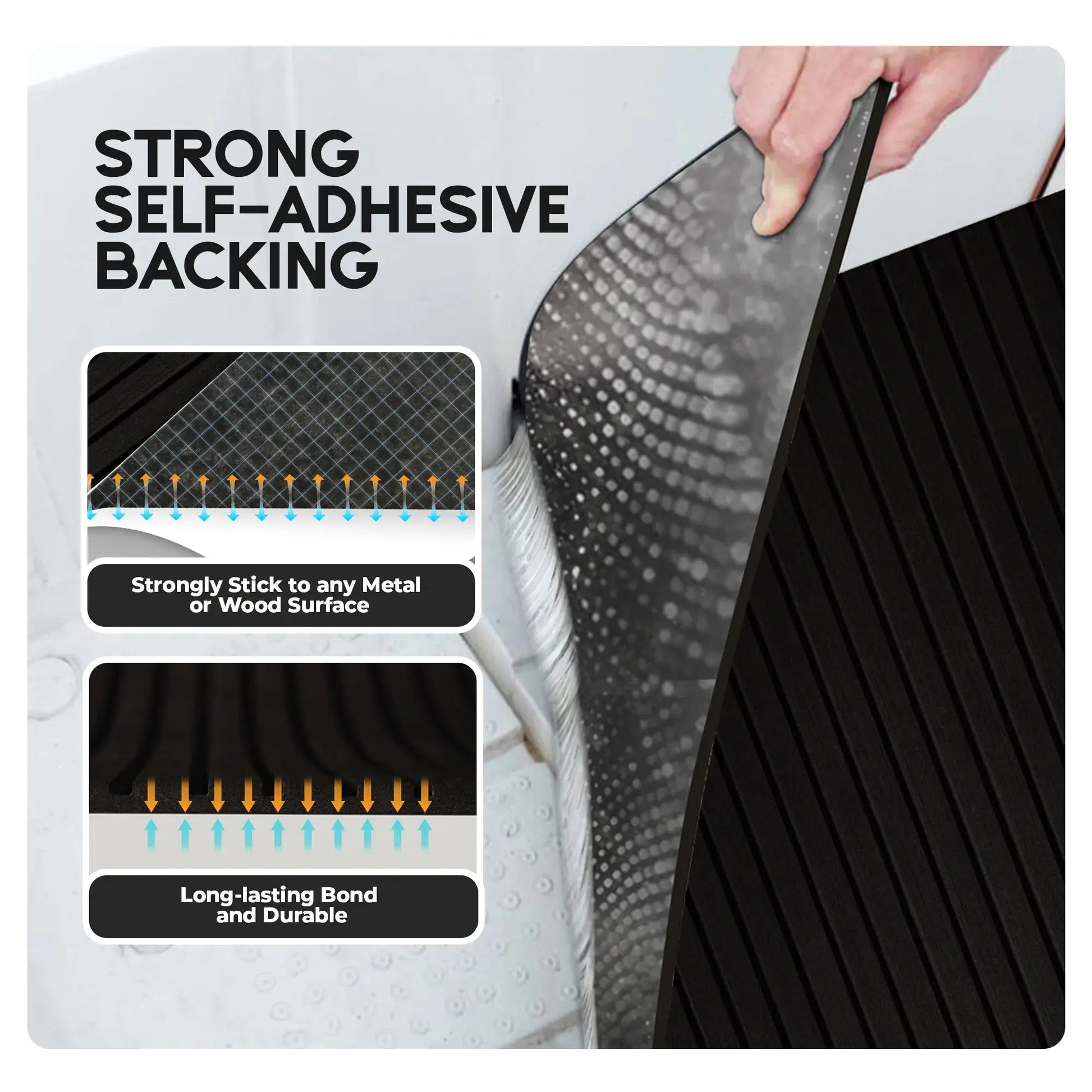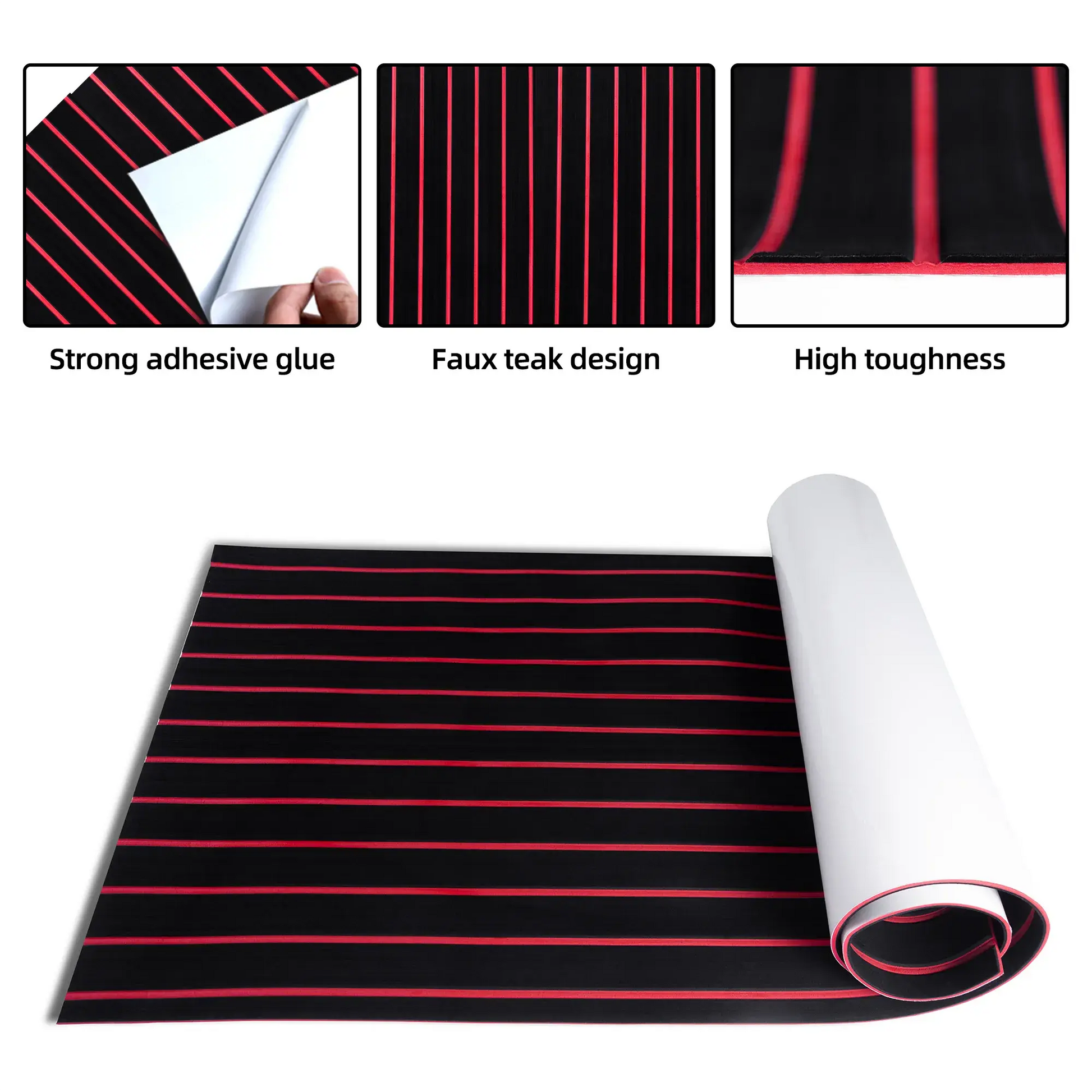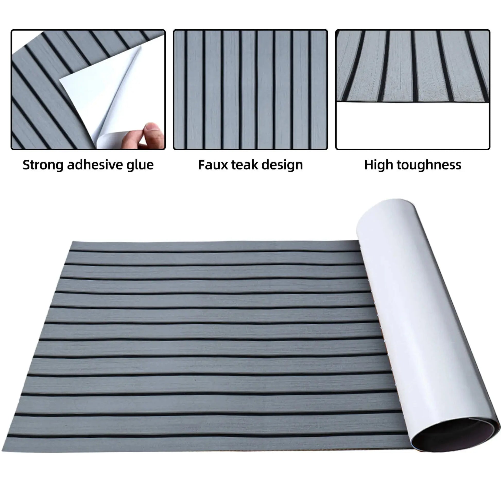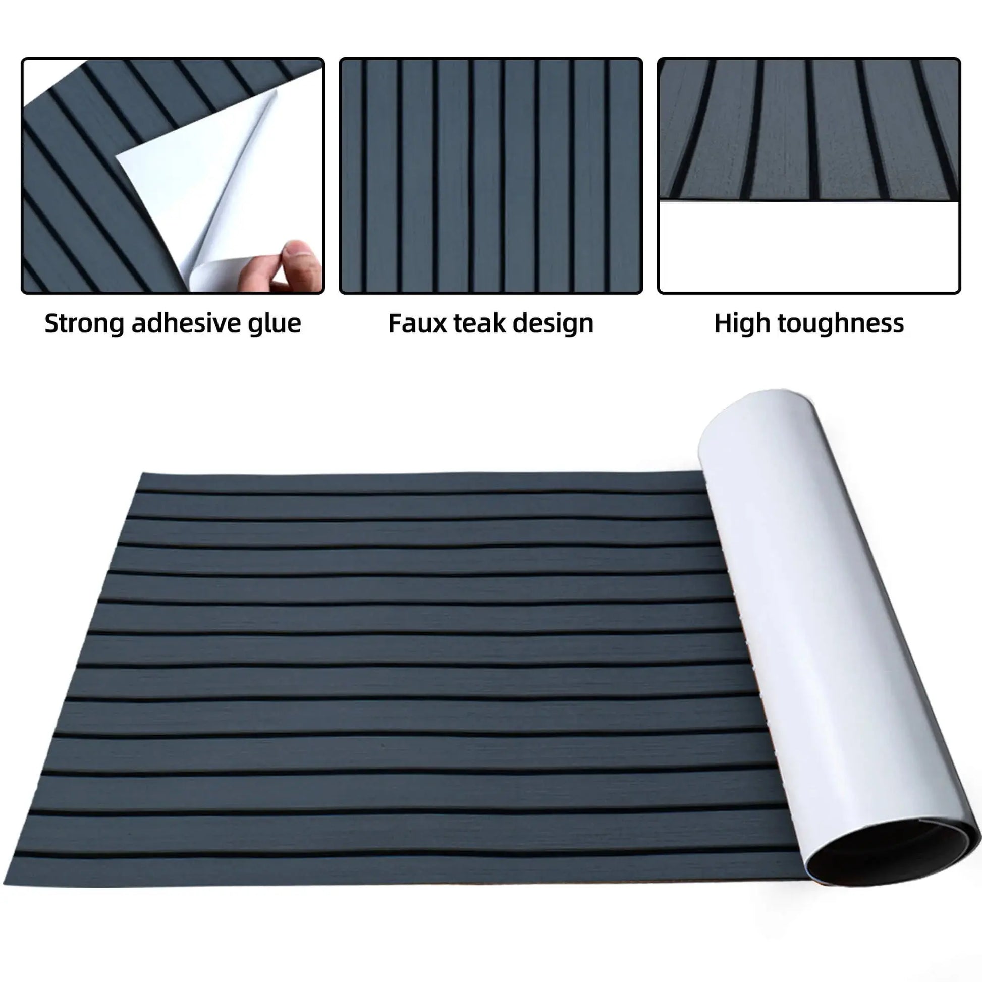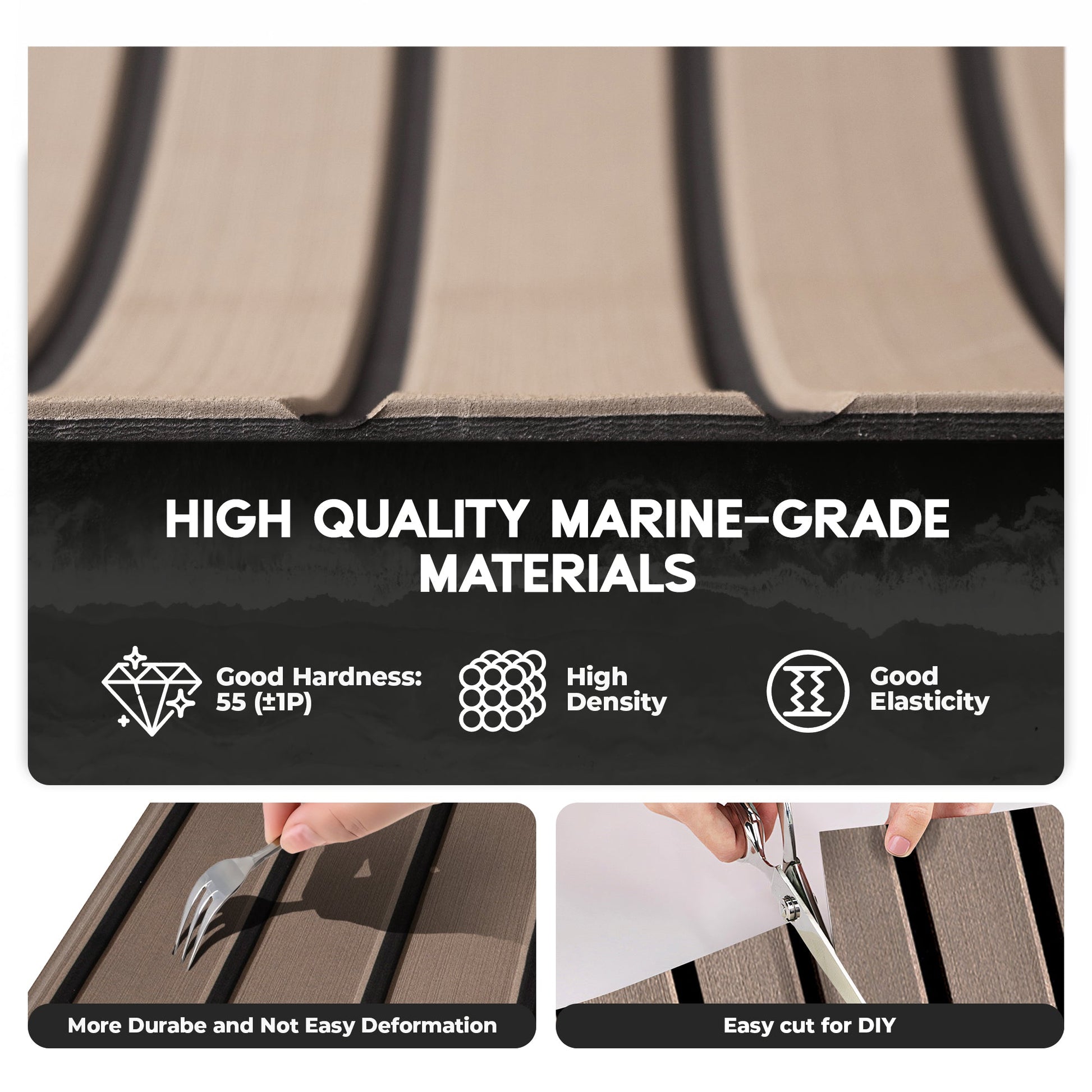 - High Quality EVA Foam - BoatFloorings Boat flooring uses high-quality EVA(Ethylene-vinyl Acetate) material. High durable eva foam boat decking; Not easy deformation; Not easy to tear or damage; Not easy to fade; High density. Maintain a constant temperature, not easy to absorb heat; Odorless, non-toxic, Non-Slip marine mat; Self-Adhesive boat carpet. Hardness: 55 (±1P)