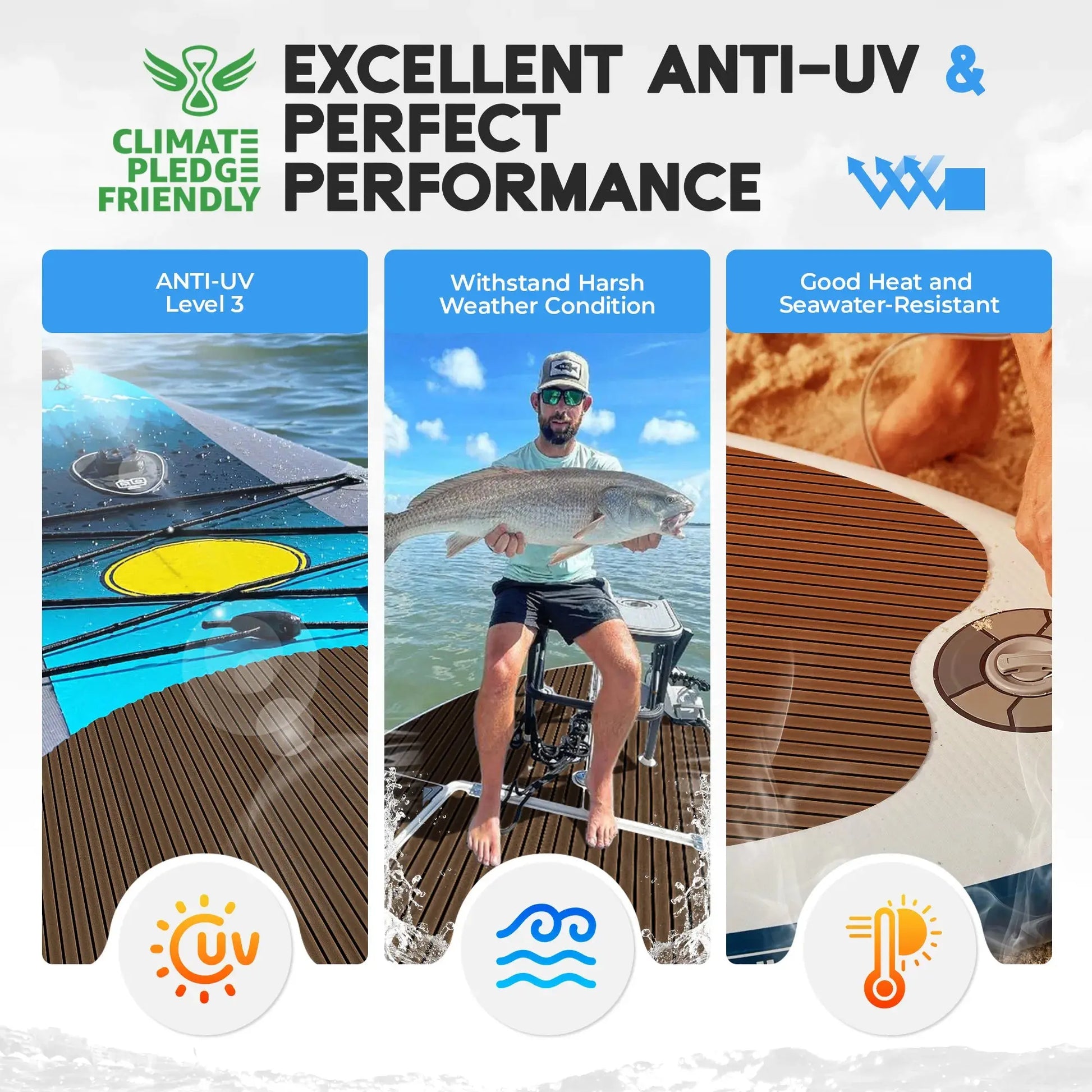 - Perfect Performance - Our EVA foam boat flooring can be easily washed with vacuum cleaner, or be pressure washed. Including: water, red wine, fish blood, sundries and anything else. Good resistance to salt water and not easy to absorb heat. Fully combining ergonomic principles to design will definitely give you an excellent experience