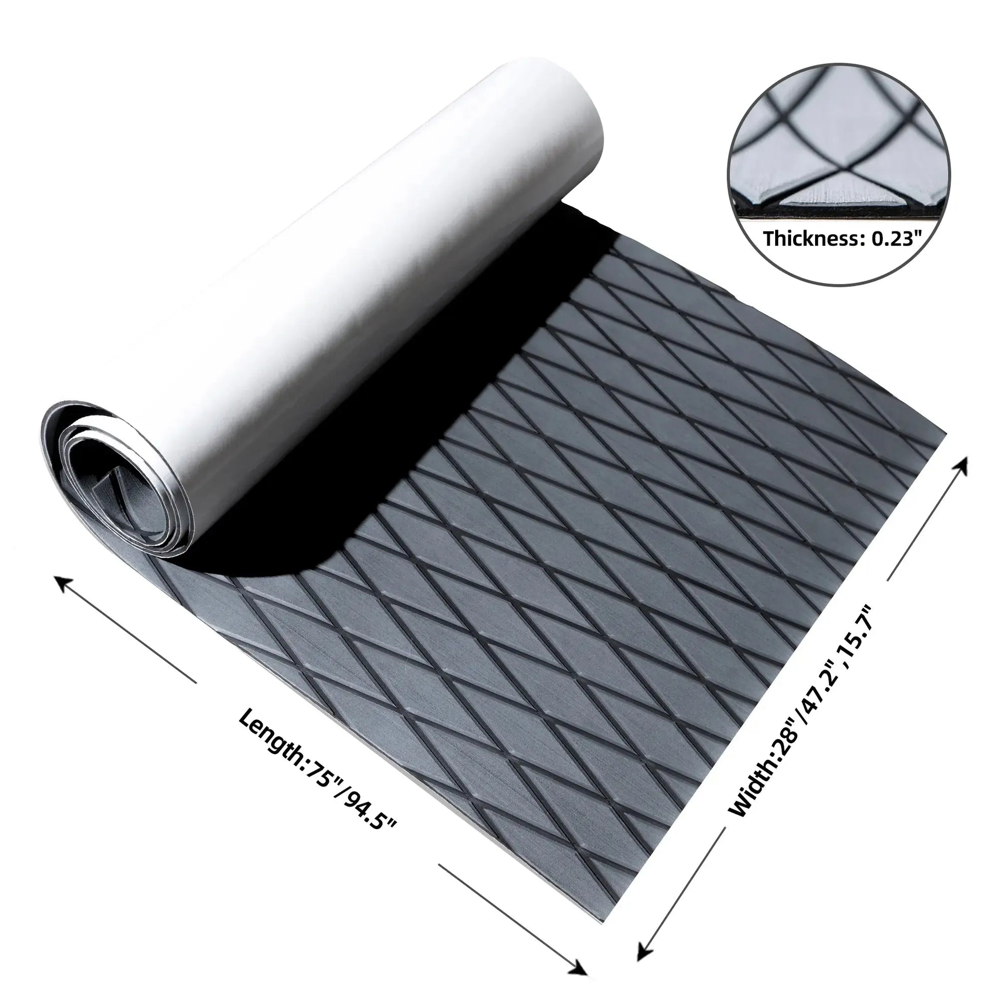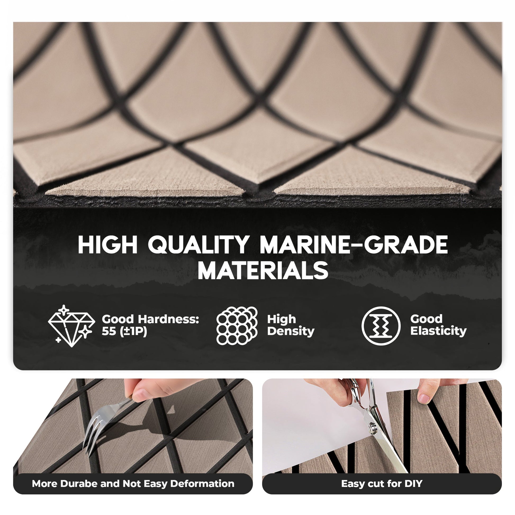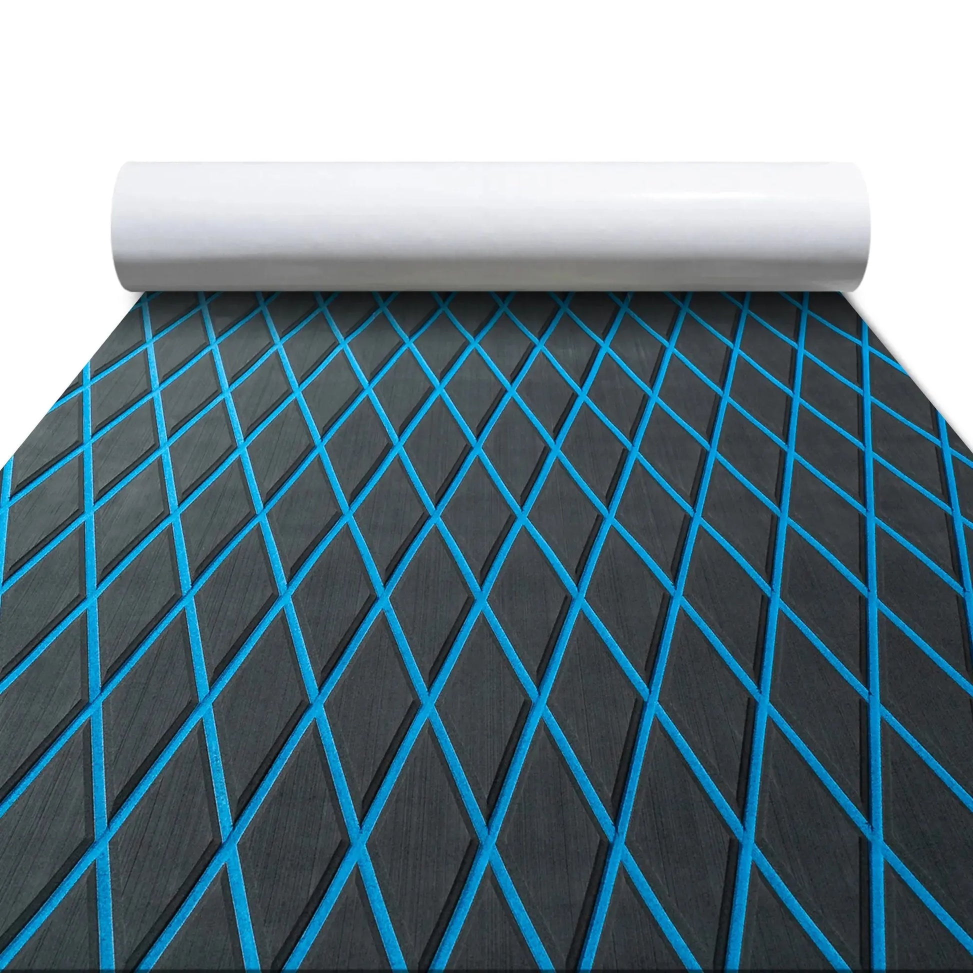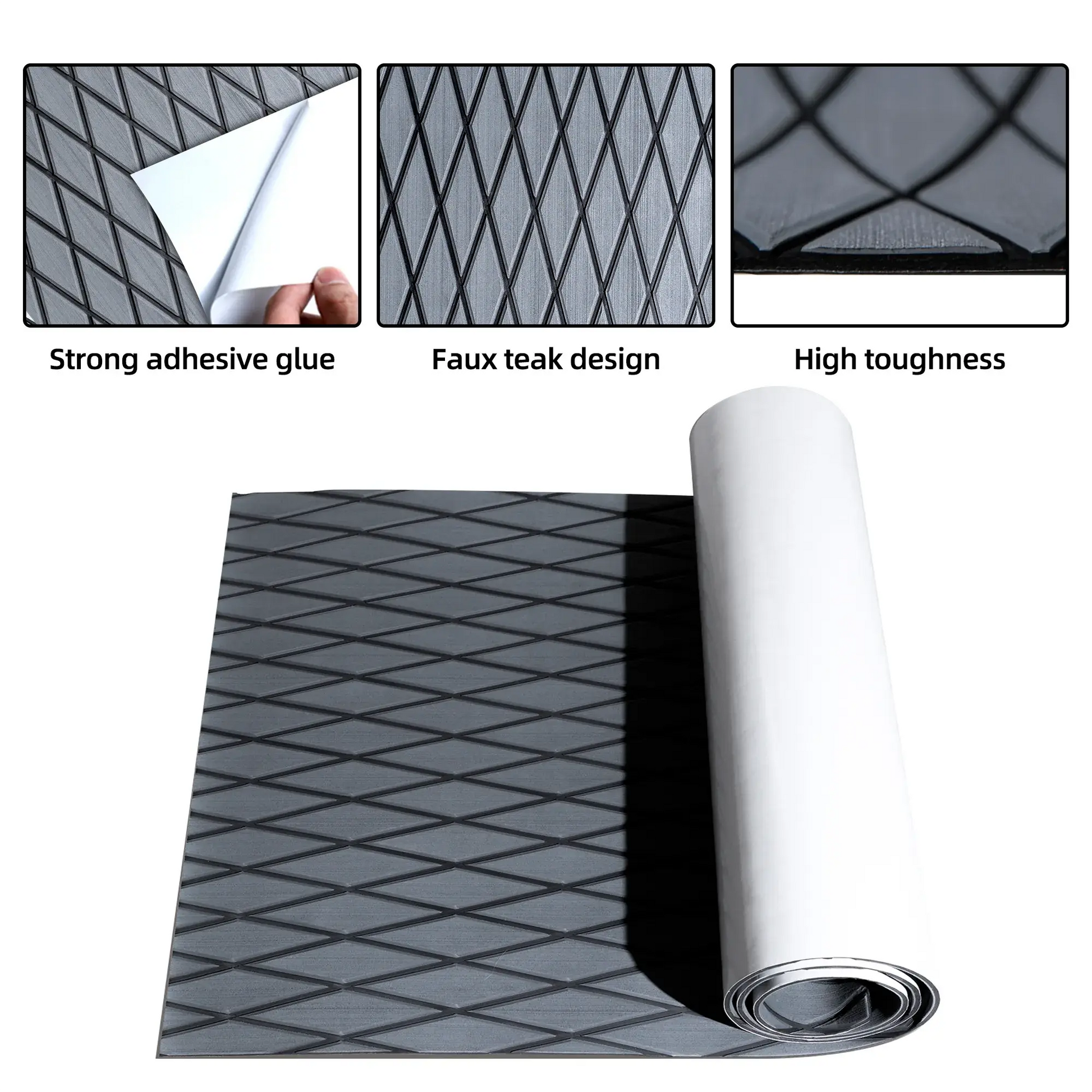 - High Quality EVA Foam - BoatFloorings Boat flooring uses high-quality EVA(Ethylene-vinyl Acetate) material. High durable eva foam boat decking; Not easy deformation; Not easy to tear or damage; Not easy to fade; High density. Maintain a constant temperature, not easy to absorb heat; Odorless, non-toxic, Non-Slip marine mat; Self-Adhesive boat carpet. Hardness: 55 (±1P)