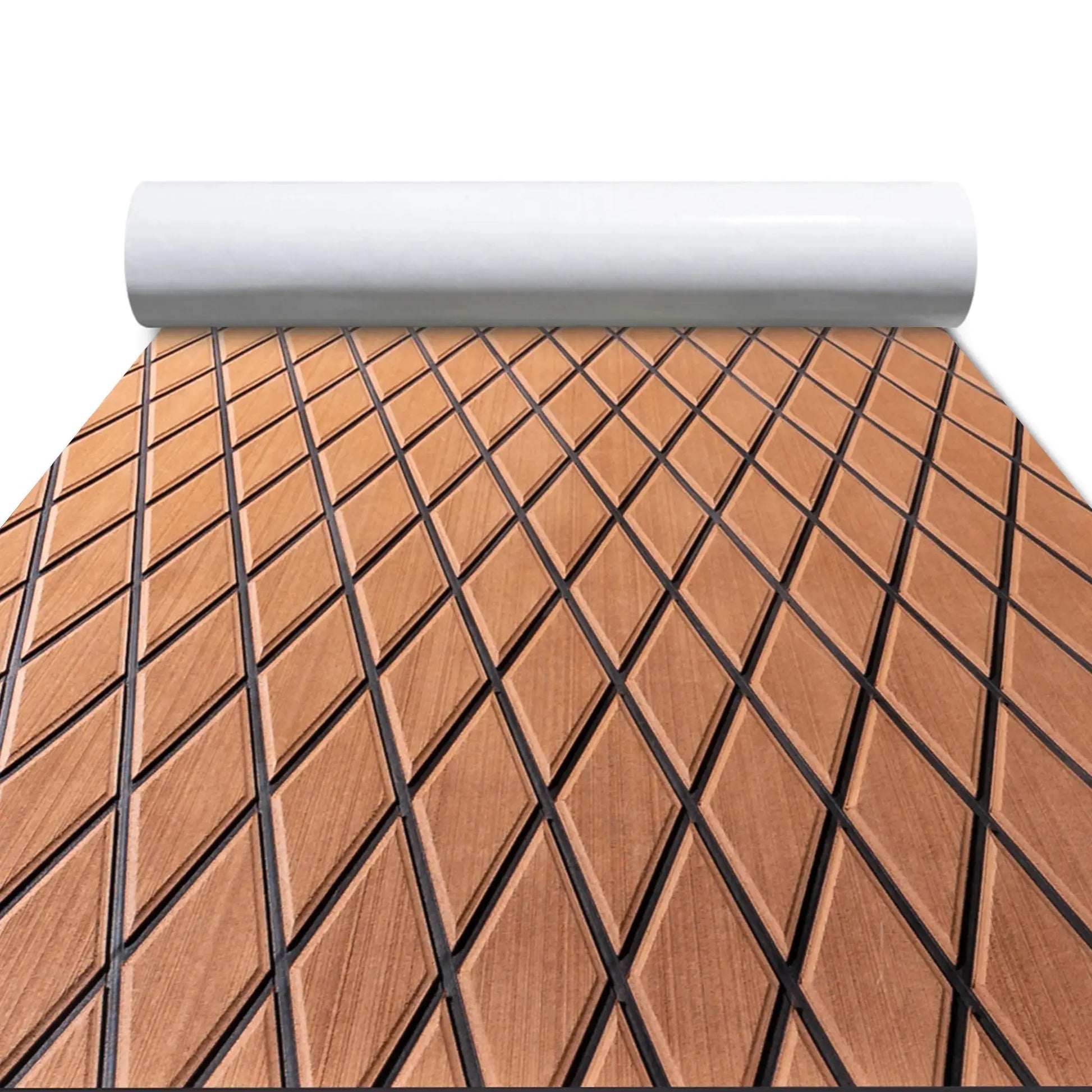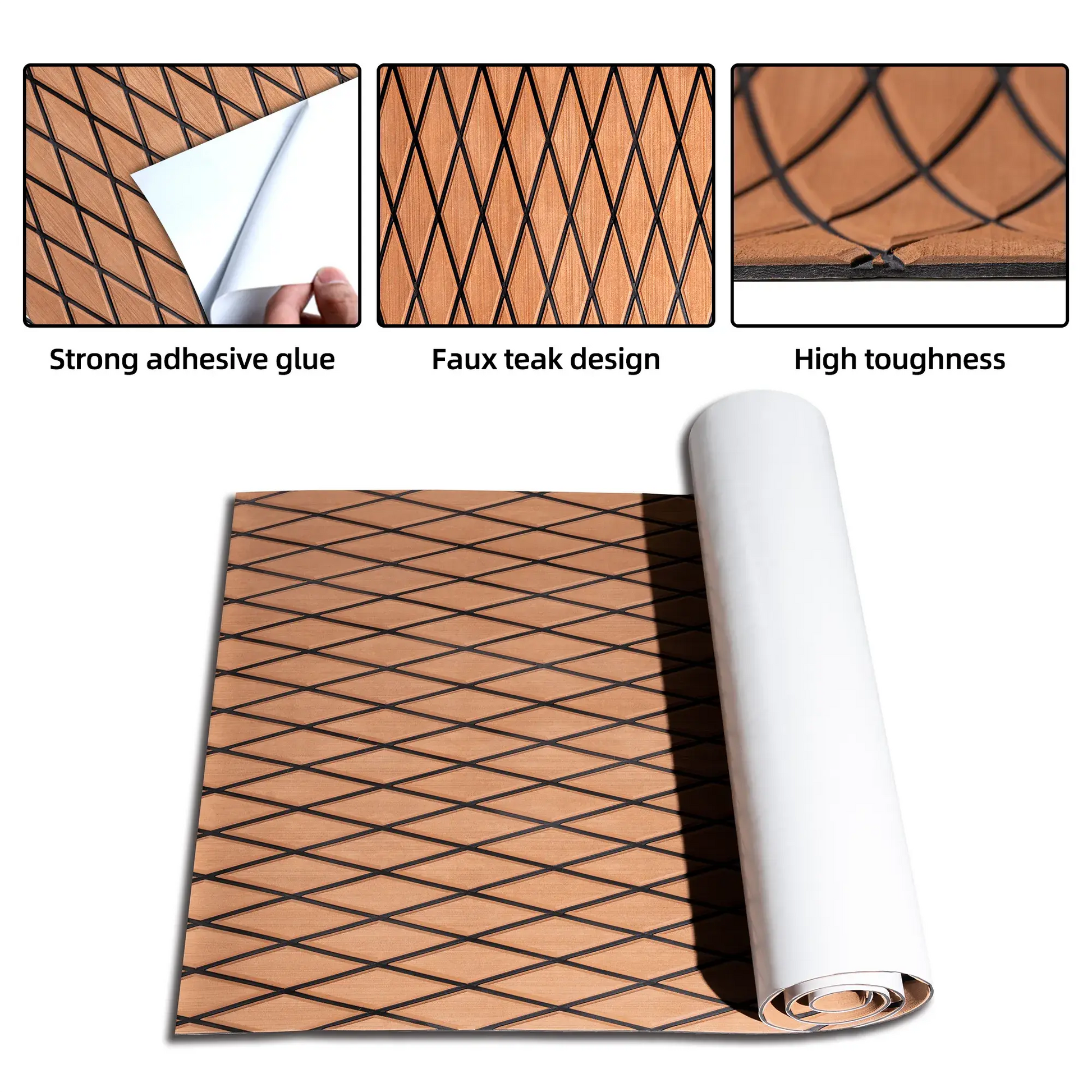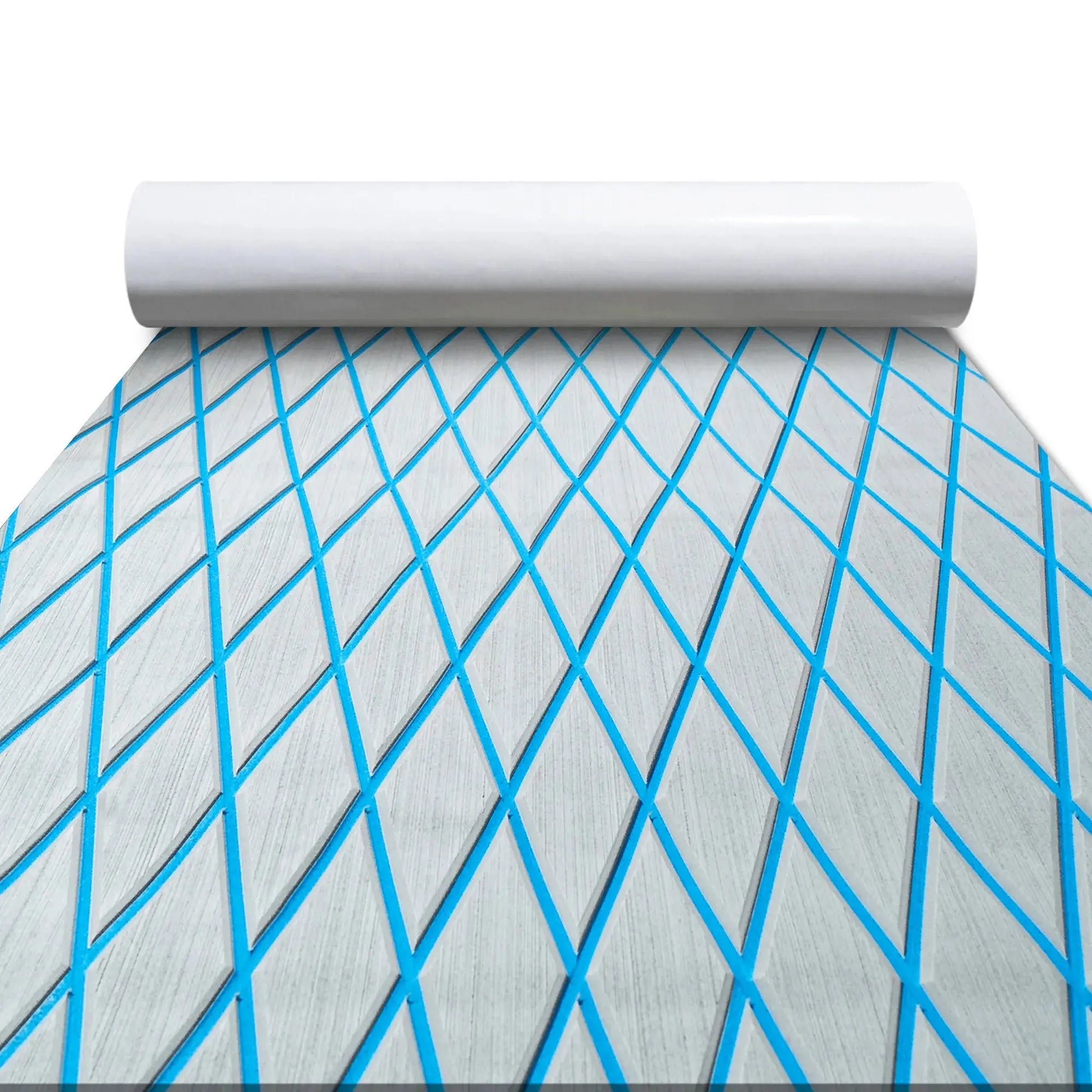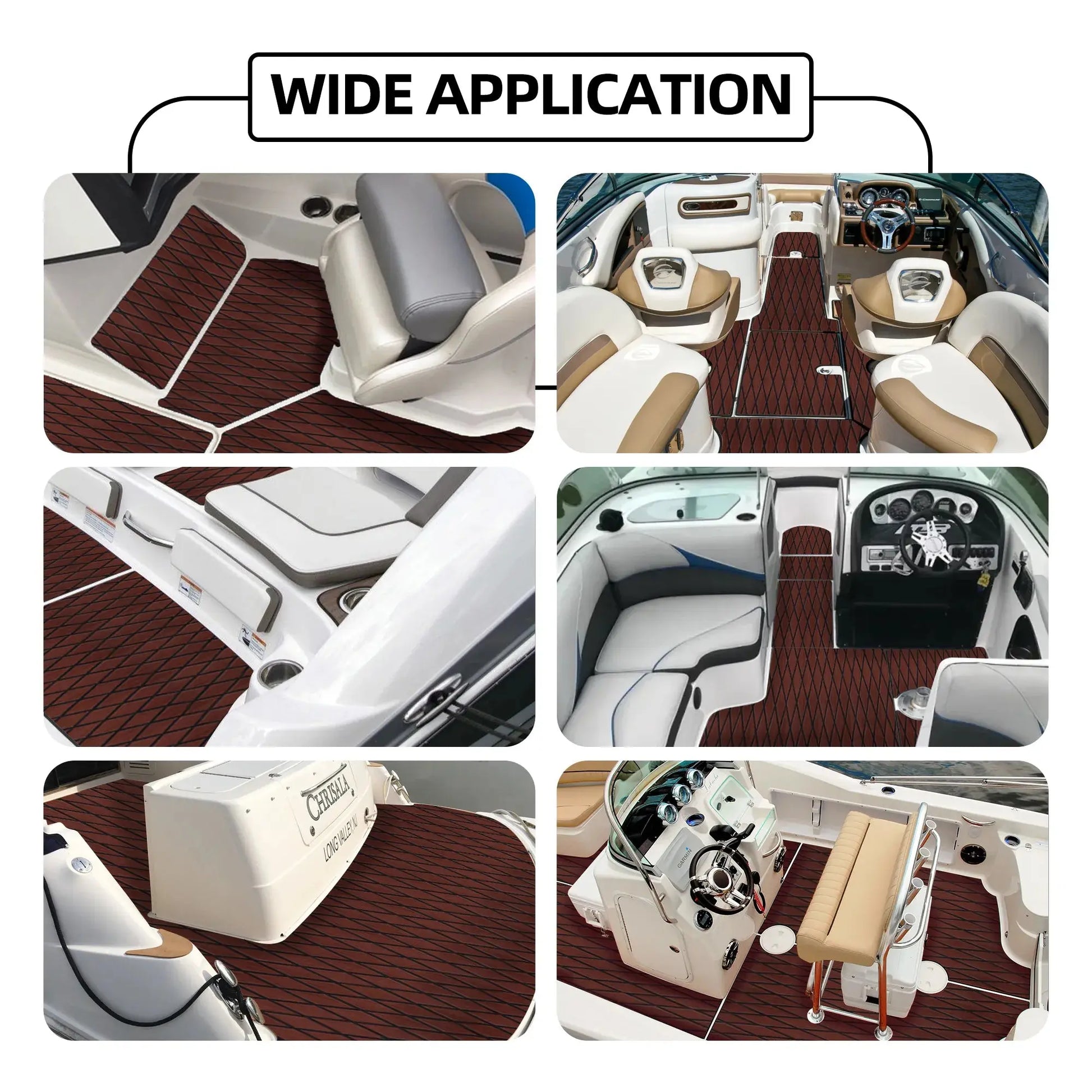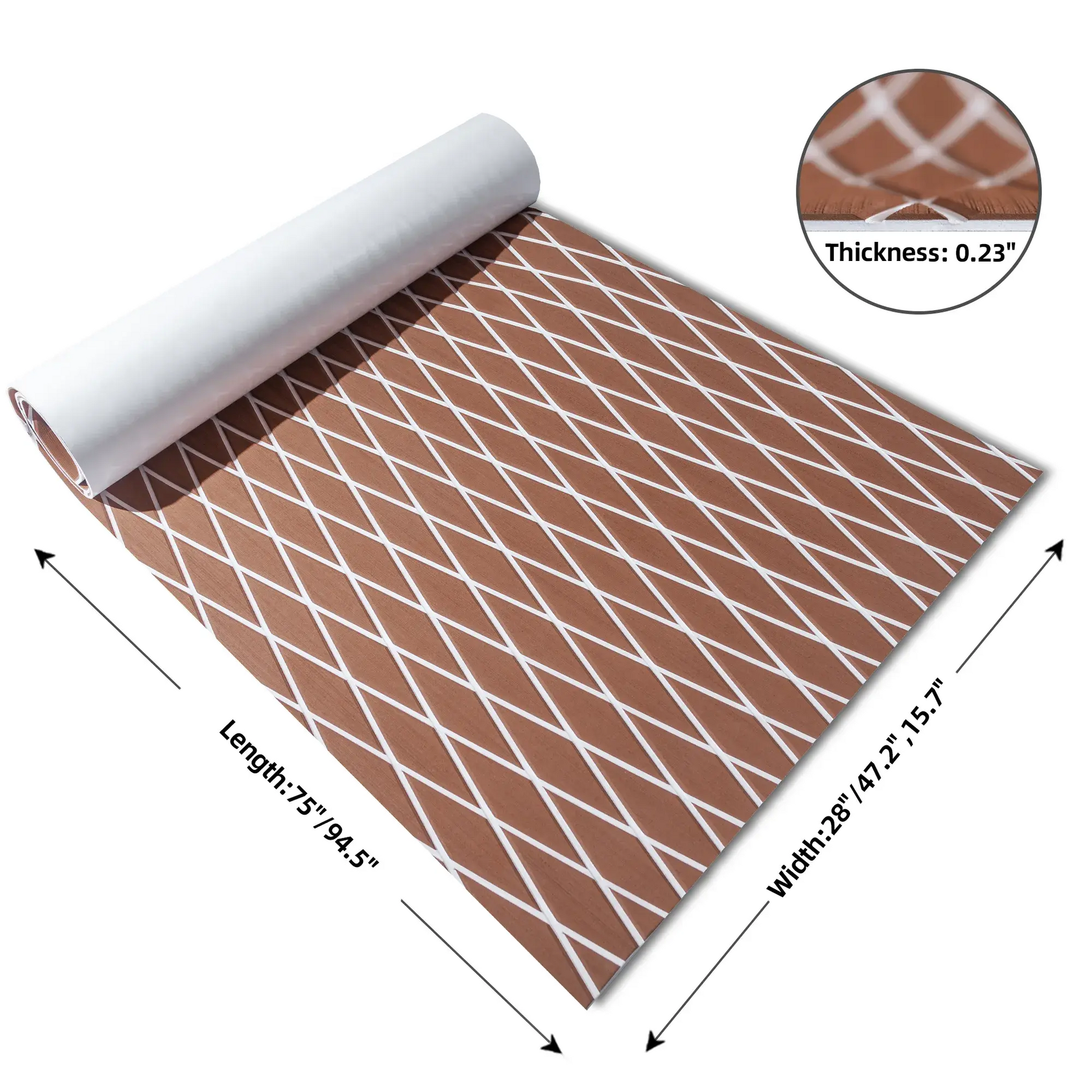 - High Quality EVA Foam - BoatFloorings Boat flooring uses high-quality EVA(Ethylene-vinyl Acetate) material. High durable eva foam boat decking; Not easy deformation; Not easy to tear or damage; Not easy to fade; High density. Maintain a constant temperature, not easy to absorb heat; Odorless, non-toxic, Non-Slip marine mat; Self-Adhesive boat carpet. Hardness: 55 (±1P)