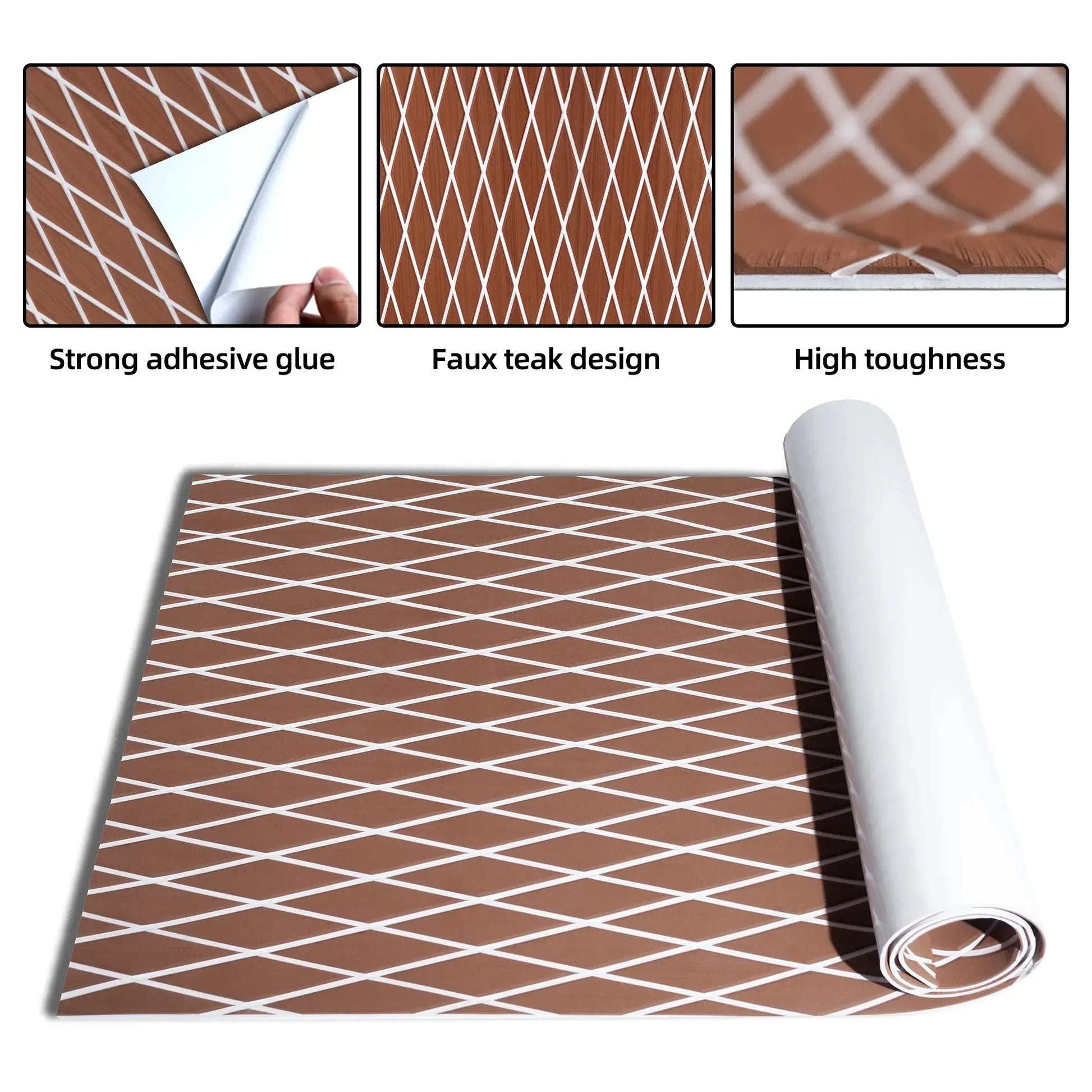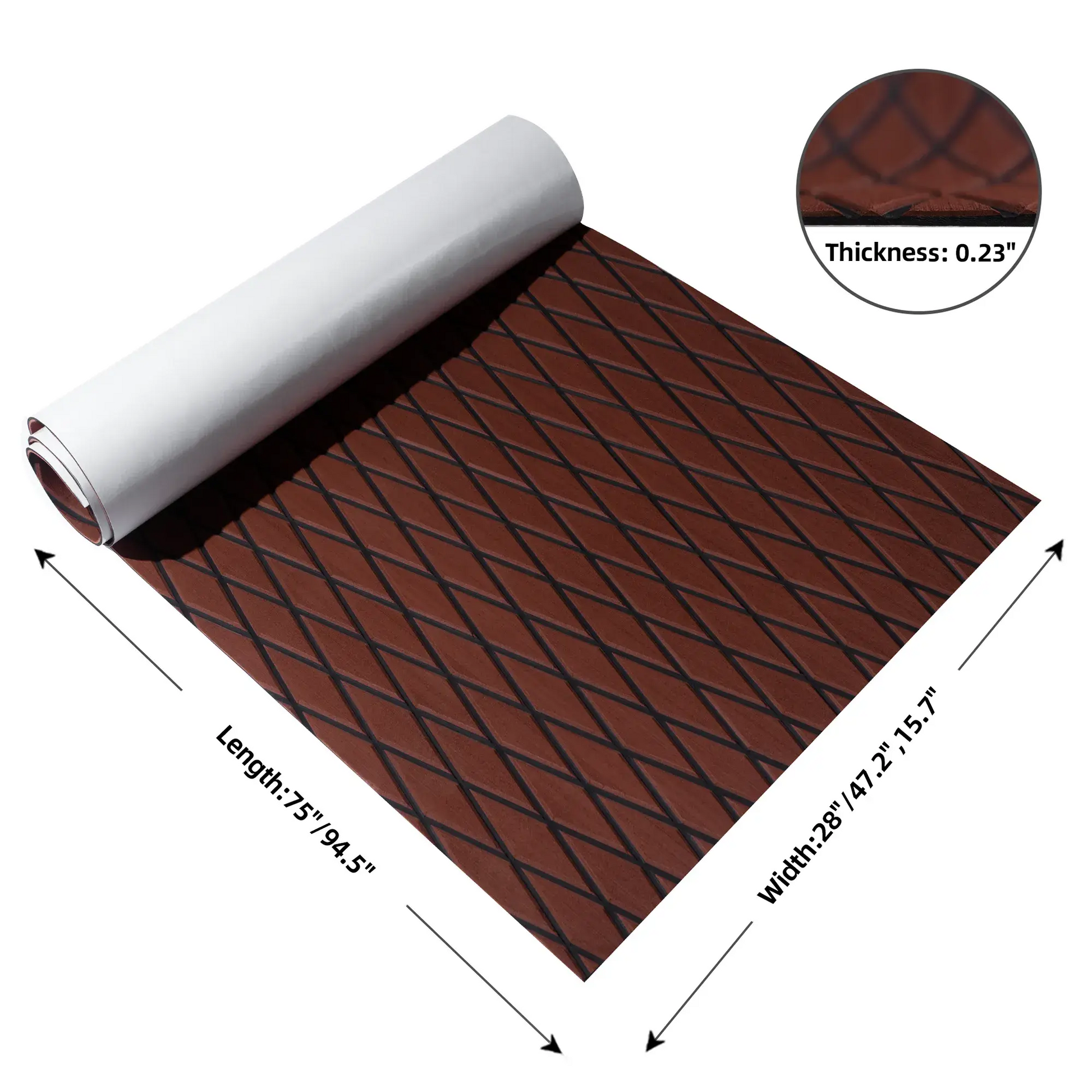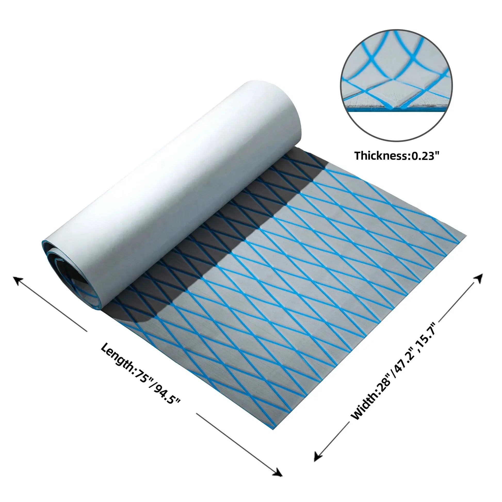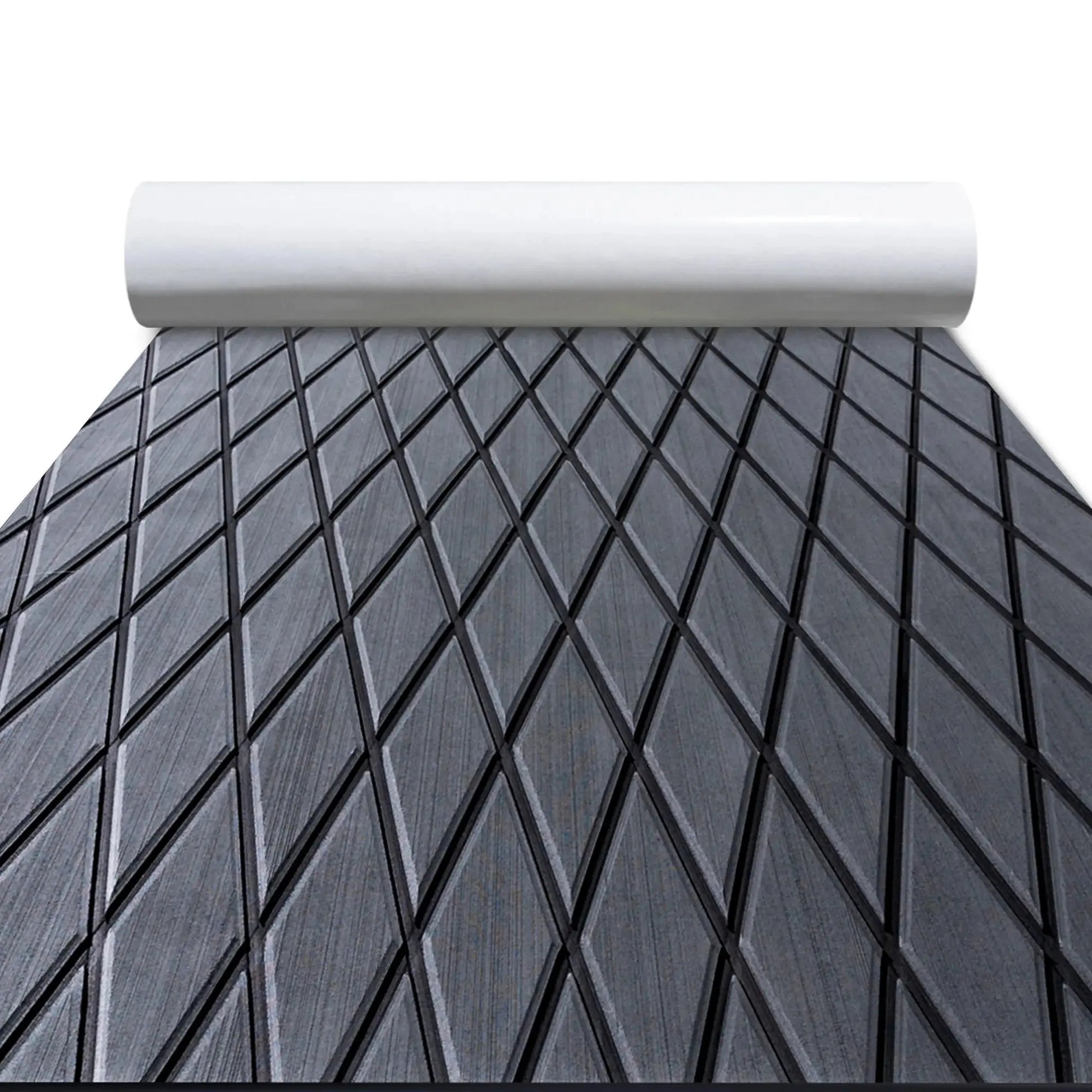 - High Quality EVA Foam - BoatFloorings Boat flooring uses high-quality EVA(Ethylene-vinyl Acetate) material. High durable eva foam boat decking; Not easy deformation; Not easy to tear or damage; Not easy to fade; High density. Maintain a constant temperature, not easy to absorb heat; Odorless, non-toxic, Non-Slip marine mat; Self-Adhesive boat carpet. Hardness: 55 (±1P)